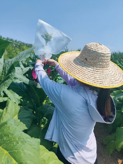 蒋亦橙在实习的烟田给烟株套袋留种。 蒋亦橙 供图