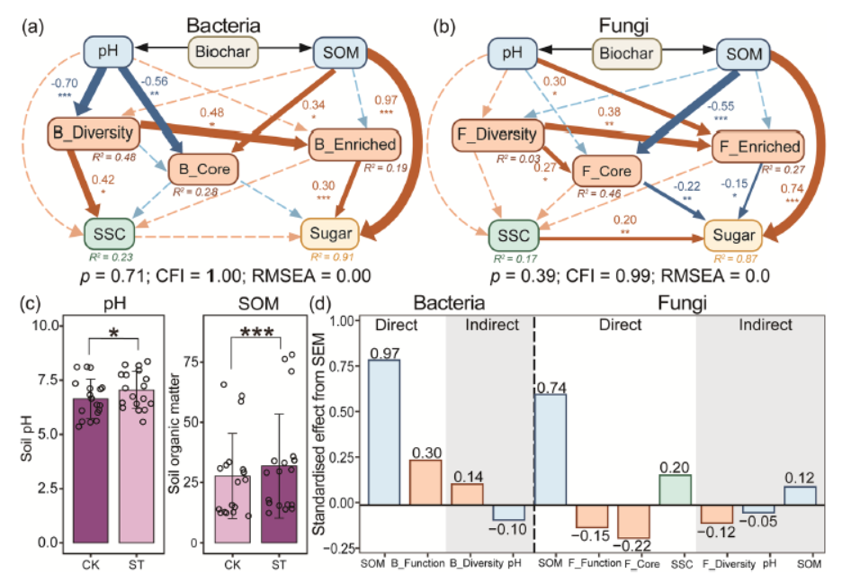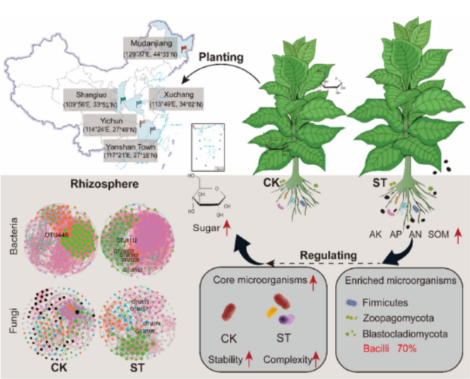 研究发现二:揭示“土壤碳–微生物–烟叶糖含量”级联增效路径。针对生物炭如何影响烟叶品质这一产业关键问题,研究团队应用结构方程模型(SEM),系统解析了多因子间的传导路径。研究发现,通过“提升土壤有机碳→优化功能微生物群落结构→富集核心功能菌群→调控次级代谢”的级联效应,显著提高烟叶可溶性糖含量和致香物质含量。该机制的阐明,不仅从理论层面夯实了土壤碳氮调节对烟叶提质增香的支撑作用,更为烟叶化学成分的精准调控提供了关键的量化依据。