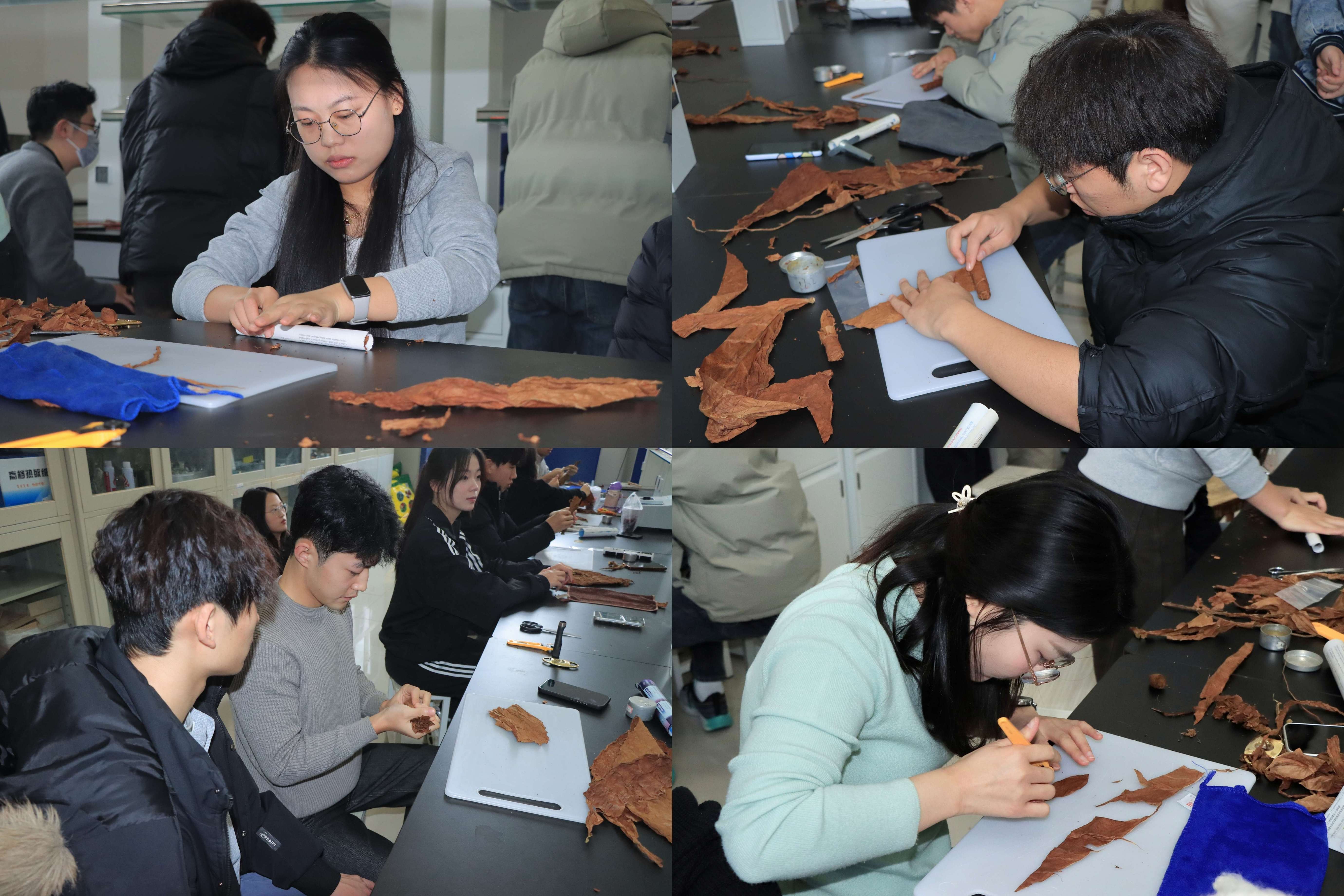 本次大赛采用两人一组协作参赛的形式,赛事全程秩序井然、氛围浓厚。比赛过程中,时向东教授与雪茄实验室专业团队深入赛场一线,针对选手卷制操作中的关键环节、细节问题进行一对一细致指导,及时纠正不规范操作,全程保障赛事规范有序推进。参赛选手沉着冷静、分工明确、配合默契,将课堂所学专业理论知识灵活融入实操环节,严格遵循雪茄卷制工艺标准完成各项操作,充分展现了烟草学院学子扎实的专业功底、严谨的治学态度和良好的竞技风貌。经过评审组现场严格打分、综合评议,大赛最终评选出一等奖3组、二等奖3组、三等奖3组,各项赛事议程圆满完成。